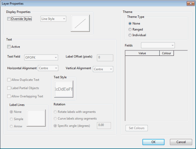 Text associated with layer objects can be displayed by checking the Active box. Edit the text appearance using the drop down boxes. It is possible to add label lines or arrows (Label lines section and to rotate labels (Rotation section). |