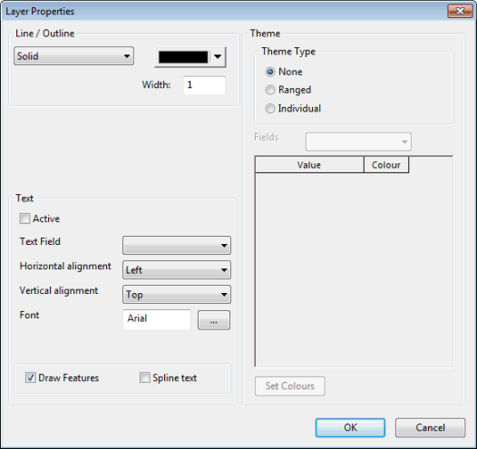 Text associated with layer objects can be displayed by checking the Active box. Edit the text appearance using the drop down boxes. Check the Draw Features box to make layer objects visible. Check the Spline text box to display text at the orientation saved in the layer file (text will displayed horizontally if this box is unchecked). |