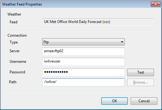 - Ftp - specify path to the weather feed file (the Browse button is currently disabled when using the Ftp option)