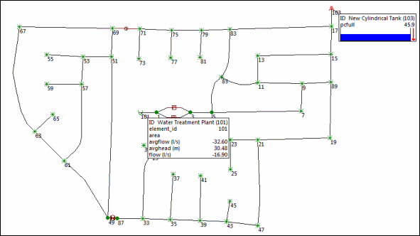 Labels showing results for a reservoir and a tank (taken from IWLive Pro (InfoWater)