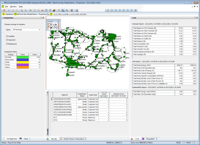 The Map view displays a detailed map of the network. The comparison theme is applied to warnings as specified in the Comparison window located to the left of the Map view. The colour coding identifies at a glance the run that has produced fewer warnings for a specific network object.