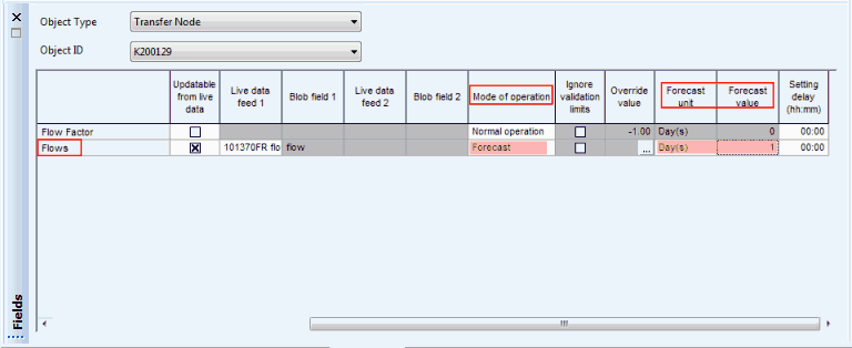 To link to telemetry, it is necessary to set the mode of operation to Forecast in the Fields window for the transfer node of interest. The Forecast Unit and Forecast Value fields must then be specified as they define the exact time period at which the link to the telemetry is to be made.