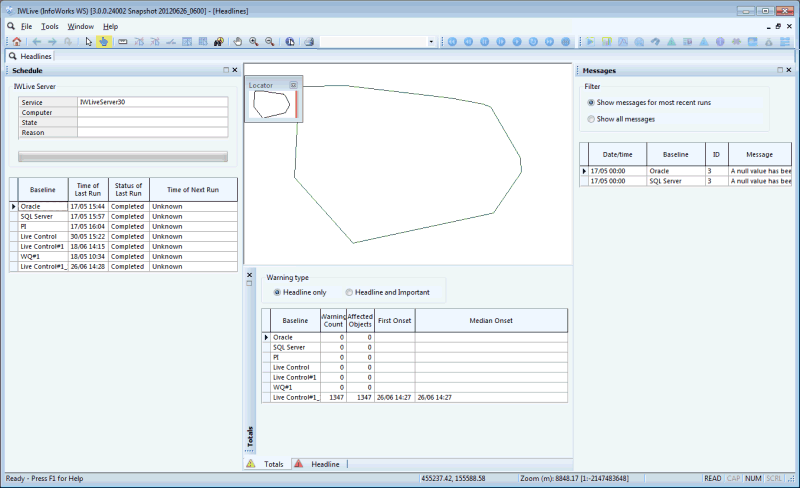The Map view displays a polygon for each baseline either generated from the network extents or user-defined. Each polygon is coloured according to the warning theme selected in the GeoPlan Properties & Themes in the Administrator mode. Background GIS Layers displayed on the Map view are specified by selection of a layer list in GeoPlan Properties & Themes.