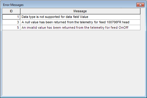 The Error Messages grid displays error messages which may occur when connecting to live data.