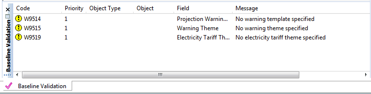 The Baseline Validation window displays error and warning messages for the currently displayed Baseline when the Baseline is validated.