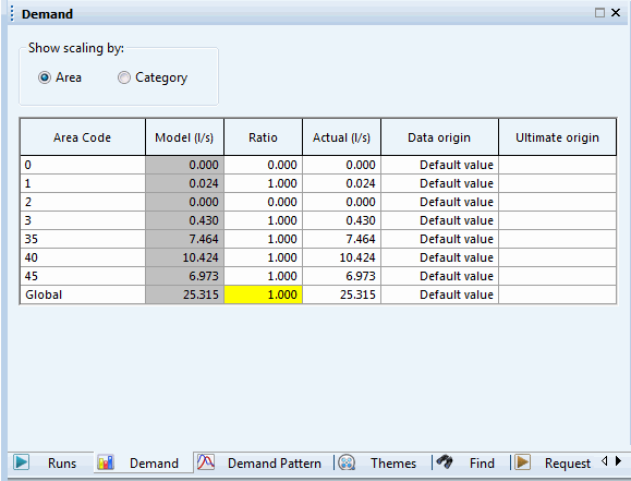 The Demand window allows adjustment of a group of demands and transfer flows (grouped by area and / or demand category) by applying multiplying factors to existing model demands assigned to nodes. This functionality should be used if you want to model changes in demand without altering the values for individual nodes.