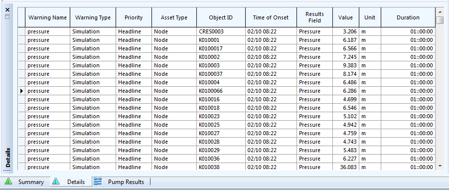 Time of Onset | Simulation time at which the event that triggered the warning first started |