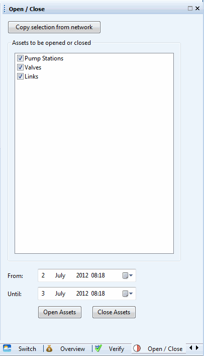 - Click the Copy selection from network button to copy the Map view selection to the Assets to be opened or closed tree.