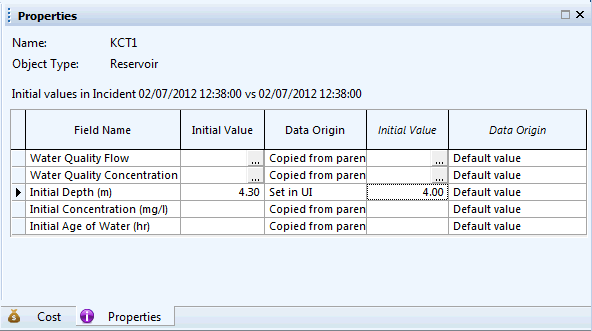 This means that some network objects will have associated Water Quality fields (e.g. Initial Concentration and Initial Age of Water for reservoirs) and these will be displayed on the Properties window. These fields are enabled for Water Quality runs and will be greyed out otherwise.