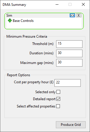 The Demand Management Area (DMA) Summary dialog is used to produce a grid report of failures that meet a defined minimum pressure criteria for a selected simulation. The dialog is displayed when Results | Grid reports | DMA Summary is selected in the Results menu.