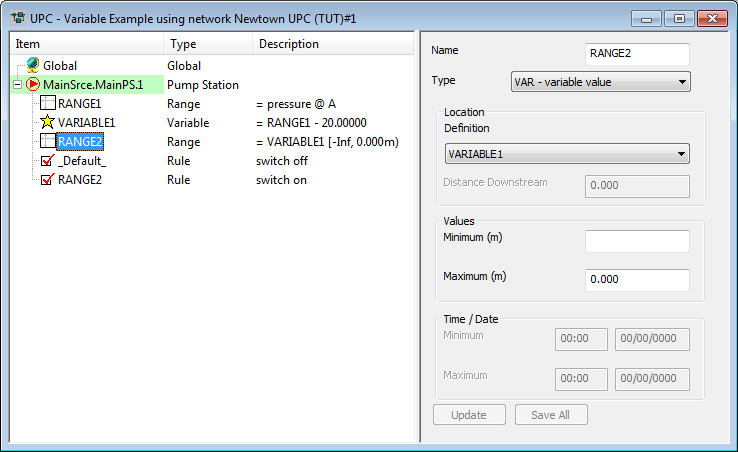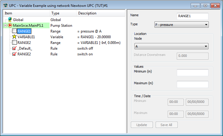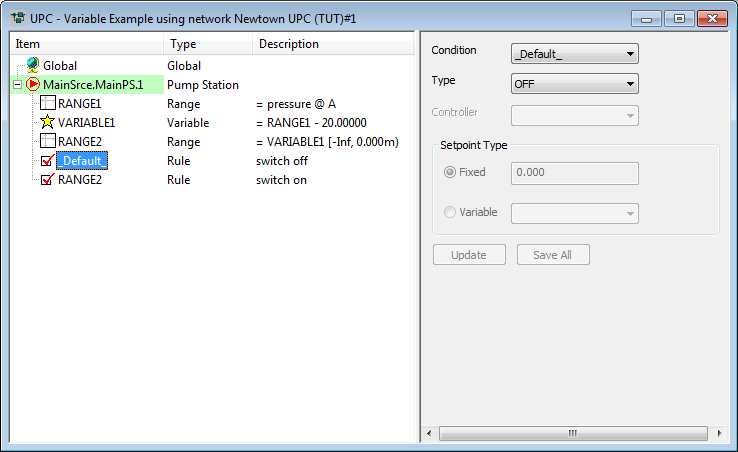 In this scenario, a variable is used to calculate a pressure offset at sensor Node A. The default status of the pump is OFF. If the pressure at Node A falls below 20m, the pump will be switched ON.