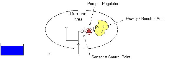 The following example shows a scenario for controlling a boosted flow into an area subject to low pressures within a gravity fed demand area. If the pressure at a sensor in the demand area falls below a given pressure, the booster pump will be switched ON to boost flow to the low pressure area . Under normal conditions, the booster pump will be switched OFF and the entire area will be gravity fed.