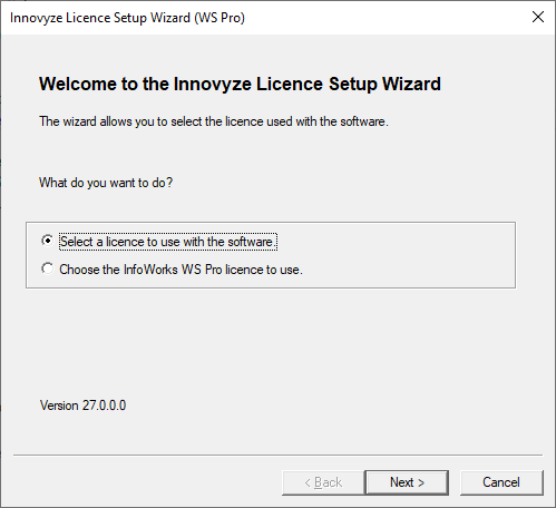- Choose the InfoWorks WS Pro license to use - choose the license(s) used by the current user and therefore the options available to the user in those applications.