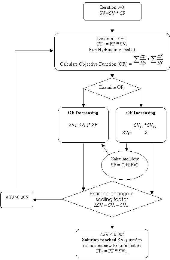 - ΔSV = change in scaling value, is a convergence parameter which tends to zero as solution reaches minimum objective function (sum of differences). There is internal convergence test if change is less than 0.005 between two successive snapshots. If this is the case the process is terminated and last scaling value is adopted as the solution i.e. Final friction factors = Final Scaling Value x Original Friction Factors