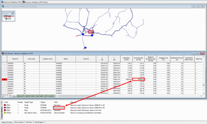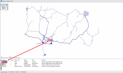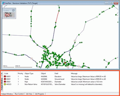 - The network is validated and the Output window is displayed. There are 4 errors. Objects causing errors are highlighted in red on the GeoPlan.If necessary, you can change the column widths by dragging the column dividers to right or left.