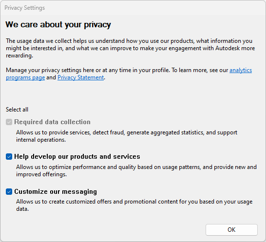 This dialog lets you choose how Autodesk can analyse your use of InfoWorks WS Pro. It is displayed by selecting Desktop analytics from the Help menu.
