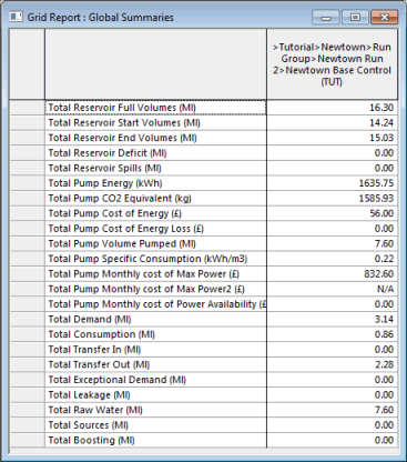 Total Reservoir Max Volumes: Sum of reservoir capacities. Total Reservoir Start Volumes: Sum of volume of water in reservoirs at start of simulation. Total Reservoir End Volumes: Sum of volume of water in reservoirs at end of simulation. Total Reservoir Deficit: Applicable in cases where a reservoir(s) has emptied:Sum of the total amount of water needed to maintain head at reservoir bottom level during simulation for all reservoirs that have emptied. Total Reservoir Spills: Applicable in cases where a reservoir(s) has overflowed: Sum of the total amount of water that has overflowed from all reservoirs during simulation. Total Pump Energy: Sum of integrated pumping station power over time for all pumping stations. Total Pump CO2 Equivalent: Total pump energy expressed as a carbon dioxide equivalent. See Sustainability Analysis. Total Pump Cost of Energy: Pump Energy x Daily Rates Charge Where Daily Rates Charge is defined on the Daily Rates page of the Electricity Tariff. Total Pump Cost of Energy Loss: Pump Energy Loss x Daily Rates charge Where: Daily Rates Charge is defined on the Daily Rates page of the Electricity Tariff. Total Pump Volume Pumped: Sum of volume of water pumped from all pumping stations during simulation. Total Pump Specific Consumption: Total Pump Energy / Total Pump Volume Pumped Total Pump Monthly cost of Max Power: Sum of Maximum Cost results for all pumping stations in the network. Total Pump Monthly cost of Max Power2: Sum of Maximum Cost 2 results for all pumping stations in the network. Total Pump Monthly cost of Power Availability: Sum of cost per month of Availability Rate of Power (Capacity Charge) for all pumping stations. Calculated from: Availability Rate of Power Charge x Max Power Where