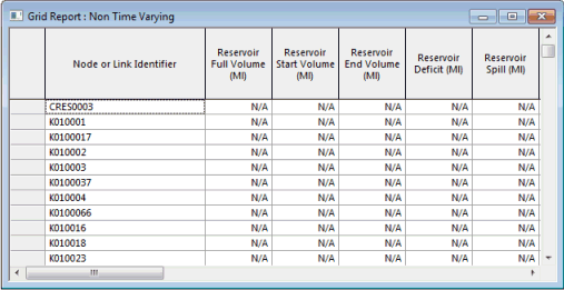 This view displays fixed results (start and end results and maxima) for selected network objects. Each object has one row in the grid. Many of the columns will be inappropriate for some object types. In this case they will be marked N/A (not applicable).