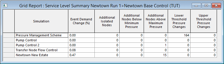 Simulation: Simulation name Event Demand Change: Percentage of demand change at Nodes / Customer Points between Simulation and base simulation. This field is only displayed when comparing simulation results to a base simulation. (Additional) Isolated Nodes / Customer Points: Number of Nodes / Customer Points that experienced a loss of supply during the simulation. (Additional) Isolated Key Customers: Number of Key Customers that experienced a loss of supply during the simulation. This field is only displayed when reporting on Customer Points. (Additional) Nodes / Customer Points Below Minimum Pressure: Number of Nodes / Customer Points that experienced a pressure below the minimum pressure limit for the duration specified in the Grid Report (Service Level) dialog. (Additional) Nodes / Customer Points Above Maximum Pressure: Number of Nodes / Customer Points that experienced a pressure above the maximum pressure limit for the duration specified in the Grid Report (Service Level) dialog. Lower Threshold Pressure Changes: Number of Nodes / Customer Points at which the Lower Pressure Threshold specified in the Grid Report (Service Level) dialog was exceeded during the simulation. This field is only displayed when comparing against a base simulation. Upper Threshold Pressure Changes: Number of Nodes / Customer Points at which the Upper Pressure Threshold specified in the Grid Report (Service Level) dialog was exceeded during the simulation. This field is only displayed when comparing against a base simulation. |