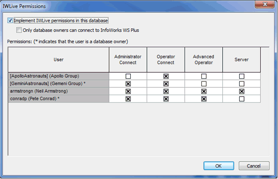 The dialog is accessible from InfoWorks WS Pro to administrators (when no objects are shown in the main window) by selecting File | Database settings | IWLive permissions. This menu item is enabled only when user permissions are implemented for the current database.