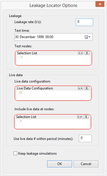 This dialog allows parameters to be set up for a leakage locator simulation.
