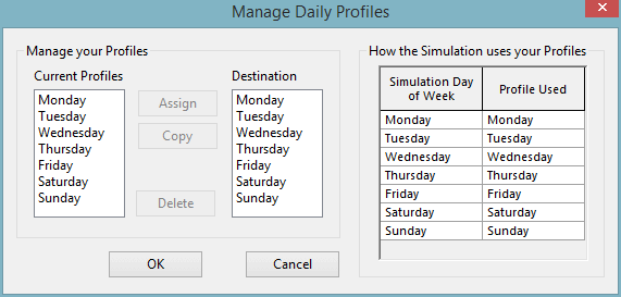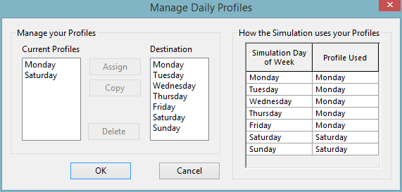 The Manage Daily Profiles dialog is used to create a seven day demand profile which can then be edited on the Demand Diagram Editor.