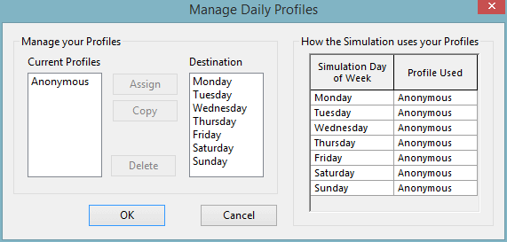 When the Manage Daily Profiles dialog is first opened, the current demand category is assigned the name of "Anonymous" and is shown in the Current Profiles section. This default profile has been assigned to all seven days of the week as can be seen in the How the Simulation uses your Profile grid.