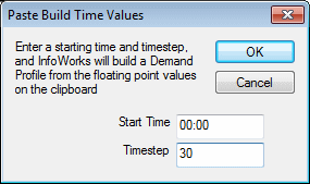 Put in a start time and timestep (minutes) and InfoWorks WS will build a grid of time/value pairs from a list of floating point values on the clipboard. It will stop as soon as it finds data that is not numeric.