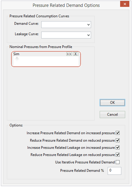 This dialog is used to select the PRD curves to be applied to demand and leakage profiles, and to set options to be used when carrying out a simulation using Pressure Related Demand.