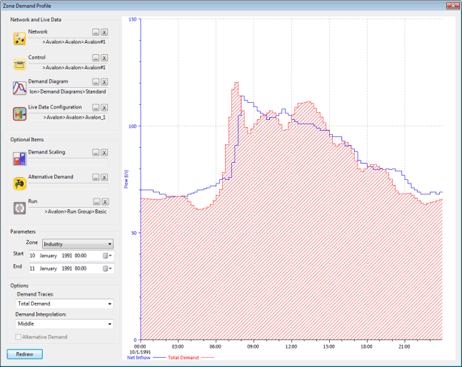 This dialog allows the net inflow into a zone (calculated from live data points) to be compared with the demand assigned to network nodes in the zone.