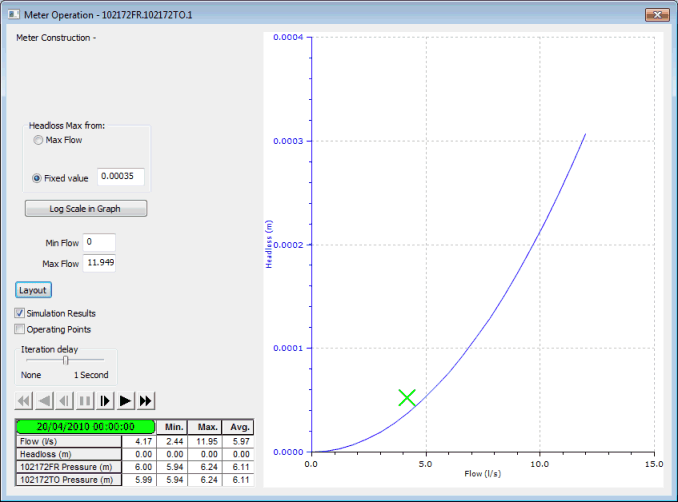If you open the report for a meter in a completed simulation, the default values for minimum flow and maximum flow are set from the minimum and maximum flow experienced through the meter during the simulation. The default "fixed value" is set from the maximum headloss experienced through the meter during the simulation. These default values can be changed by the user.