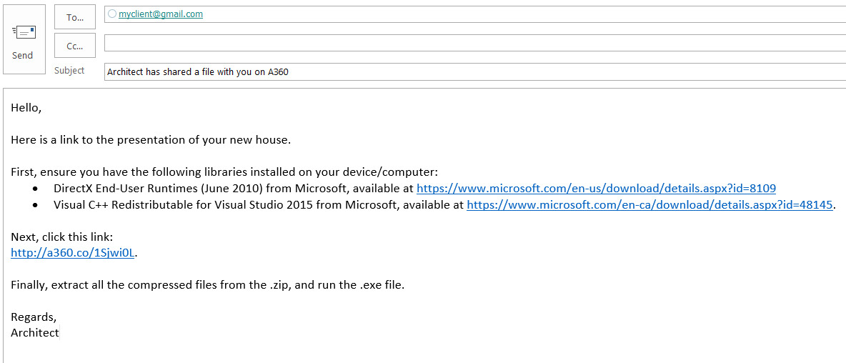 Send the .zip presentation to others using your favorite cloud collaboration service, such as Autodesk A360. Once the file has been uploaded to the cloud, you can share it by sending a link in an email.