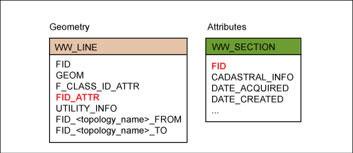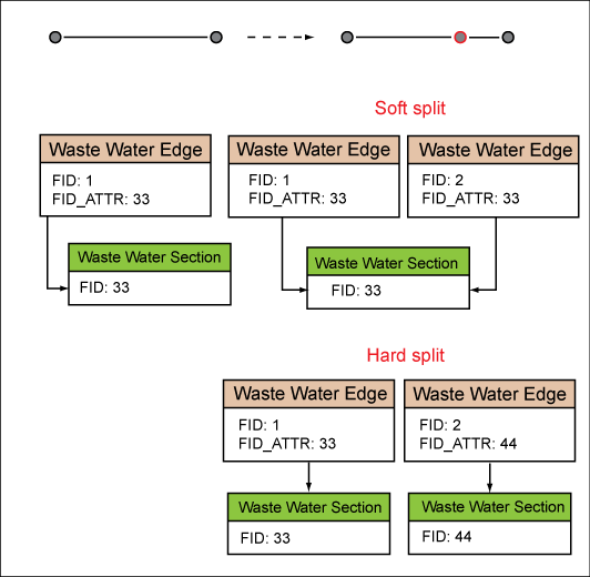 Because geometry and attributes are stored separately, one geometry features class, such a point, can reference various attribute feature classes, such as manhole, cover, fitting. For line features this allows for two different line splitting methods: soft split and hard split.