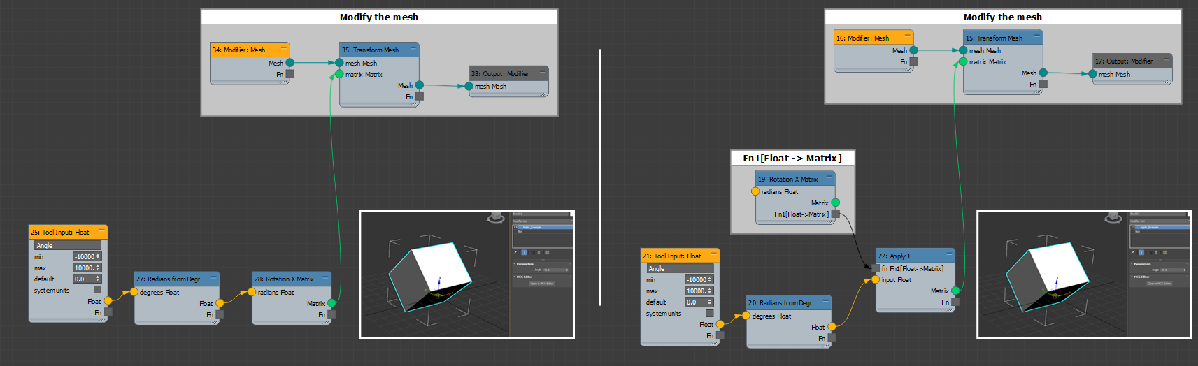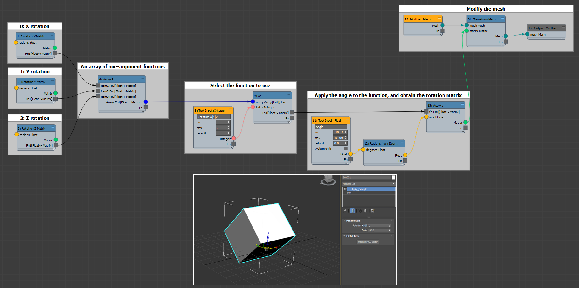 In this case, we've chosen to convert Rotation X Matrix as a function which takes one argument (recall that the arguments of a function are its unconnected inputs). This function is applied to the angle value with Apply 1. Apply 1 evaluates the supplied one-argument function with the given input. If the function exposed two arguments, we would use Apply 2 with two input values, and so on.