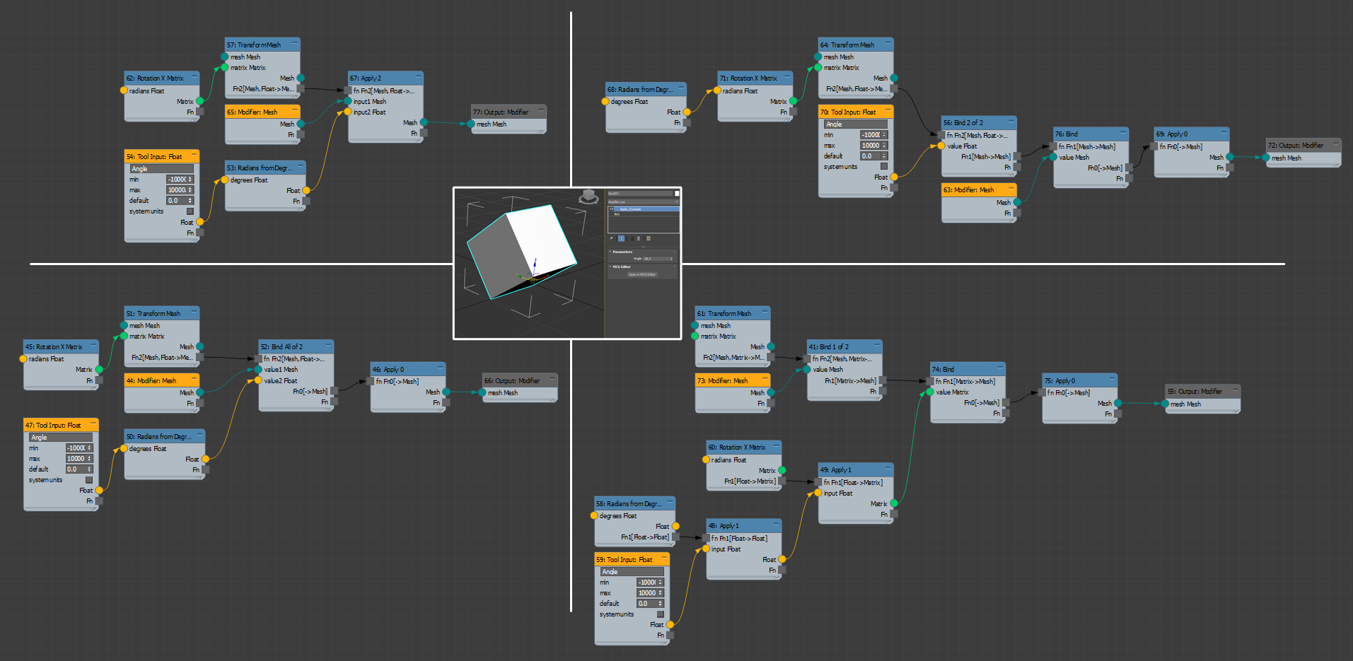 The initial example above which rotates a mesh can be re-written it in various ways using different configurations of Bind and Apply.