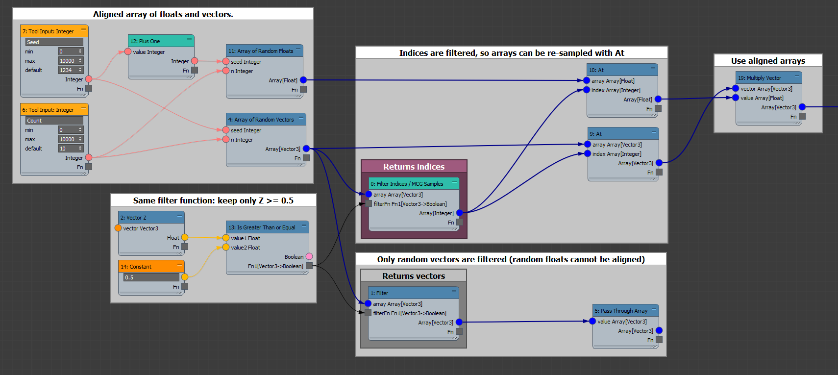To use this compound, the required function type is no different from the one used in the Filter operator, except that the output is an array of integers representing the indices of the original array. This array of indices can then be used to sample aligned arrays (compared to the normal Filter operator which only returns the preserved values, and not the indices).