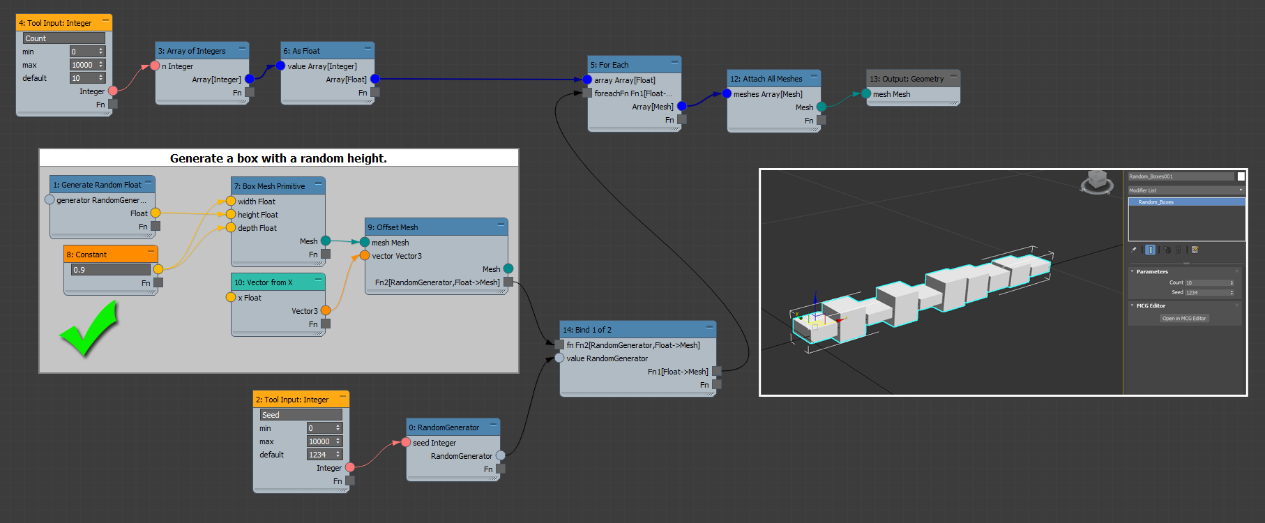 As of MCG 2018, the preferred way to generate random values is with the Array of Random [Type] operators. However, in cases where the number of random values is unknown, you may require the RandomGenerator and the Bind node.
