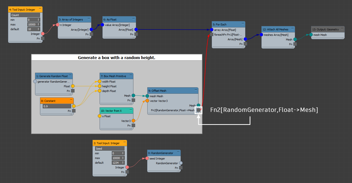 To avoid creating the generator repeatedly, we must declare it outside the function, so the first step is to disconnect it. When we do that, we notice that the function's type has changed from Fn1[Float->Mesh]