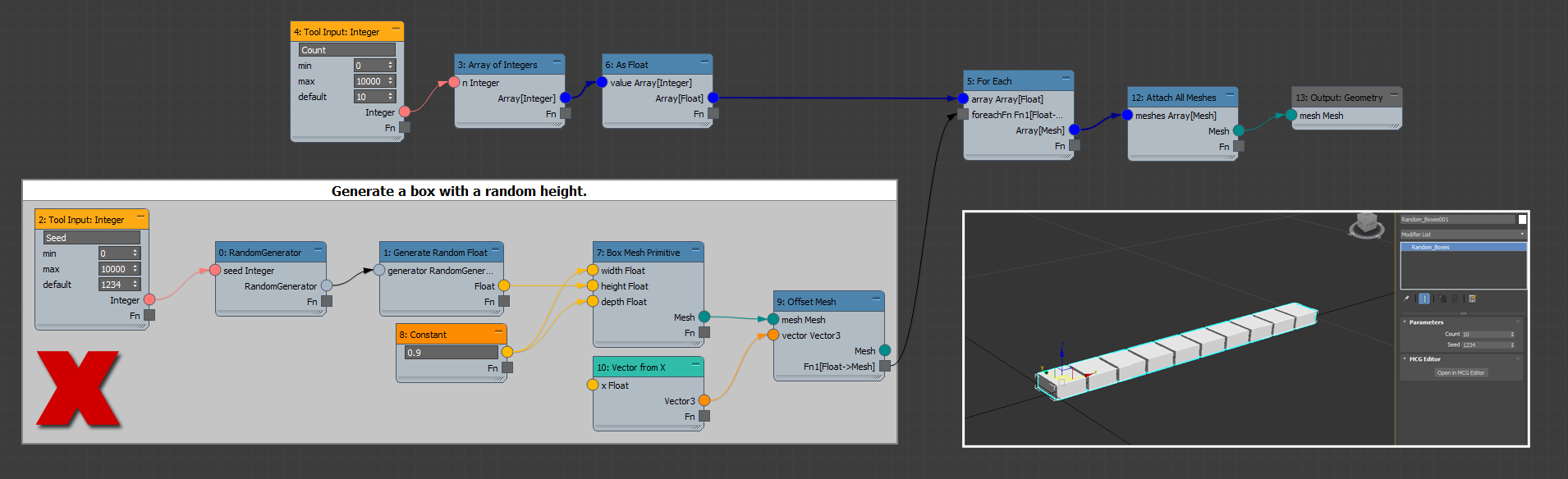 The first concept to absorb is that functions in MCG can be defined at any point, and are not exclusively bound to nodes like For Each and Combine. In the example below, we show how a node sequence can be converted into a function application.