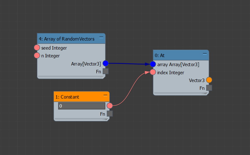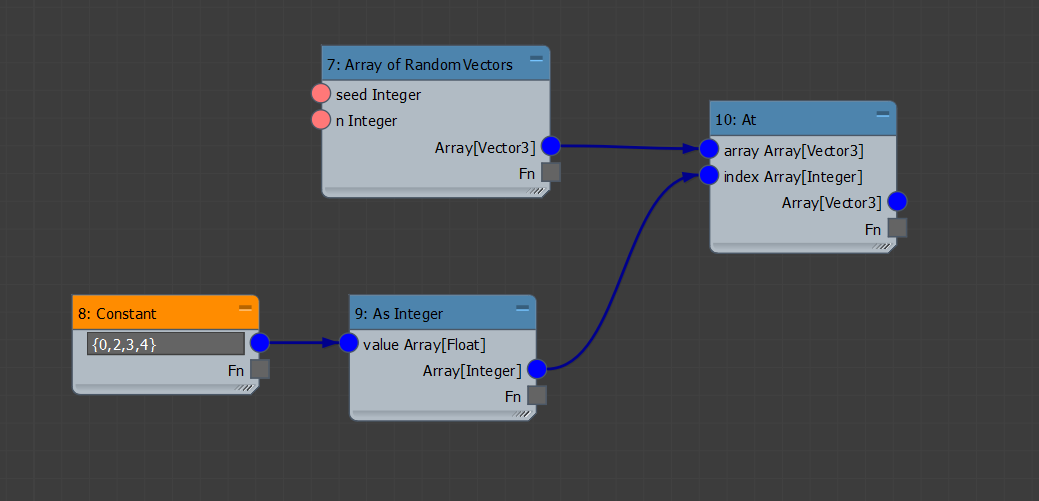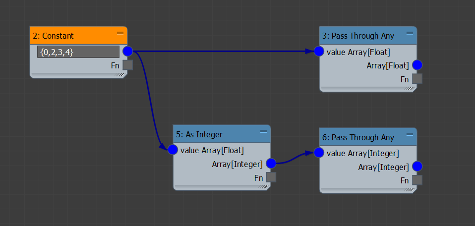 You may also specify hard-coded arrays of floats with the Constant node. The contents of the array are declared as comma-separated numbers inside curly brackets, for example: [0,2,3,4]