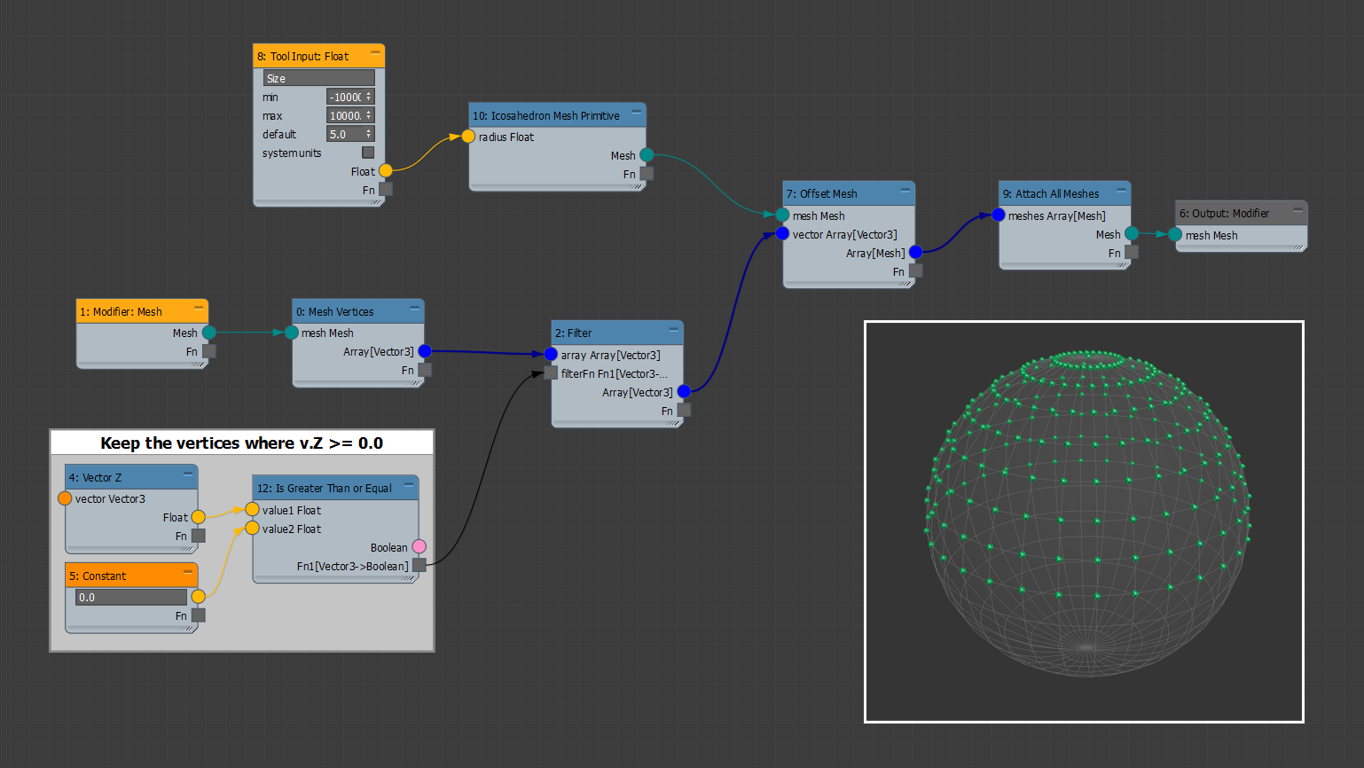 The Filter operator requires a one-argument function which returns True if the given item should be preserved in the output array. In the graph below, the Filter only keeps the vertices whose Z component is greater than or equal to 0.0.
