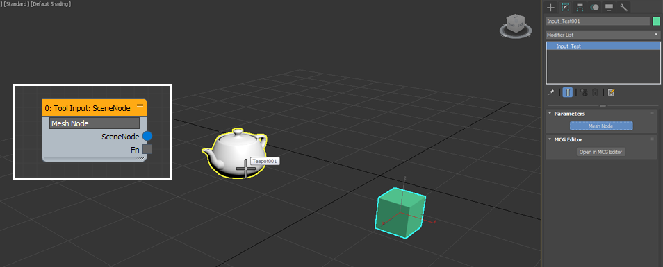 The Tool Input: SceneNode generates a pickbutton in the rollout. With this input, you may acquire any node in the scene, and access its underlying mesh or spline. Helpers may also be picked in this manner to obtain information about their positions and transforms.