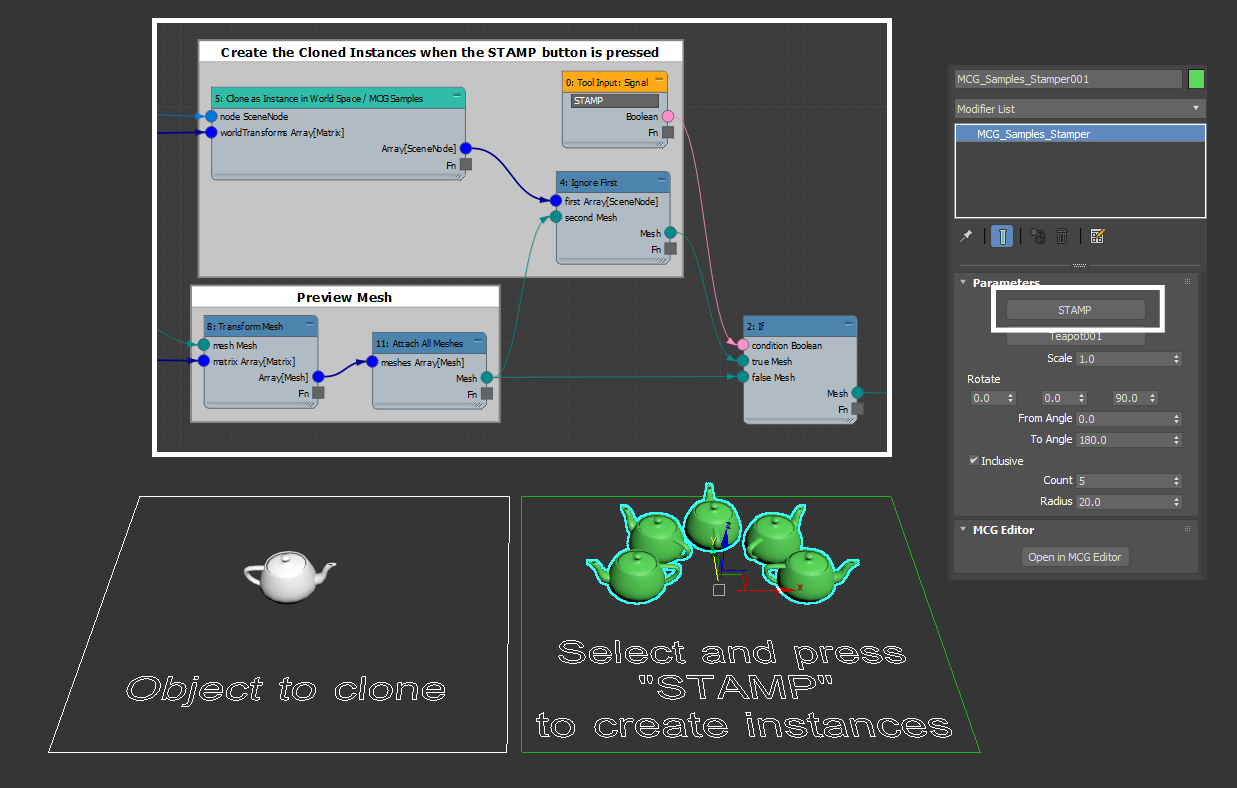 Note: The Clone as Instance in World Space compound is provided in the MCG 2018 sample pack, along with the MCG_Samples_Stamper tool (seen above).