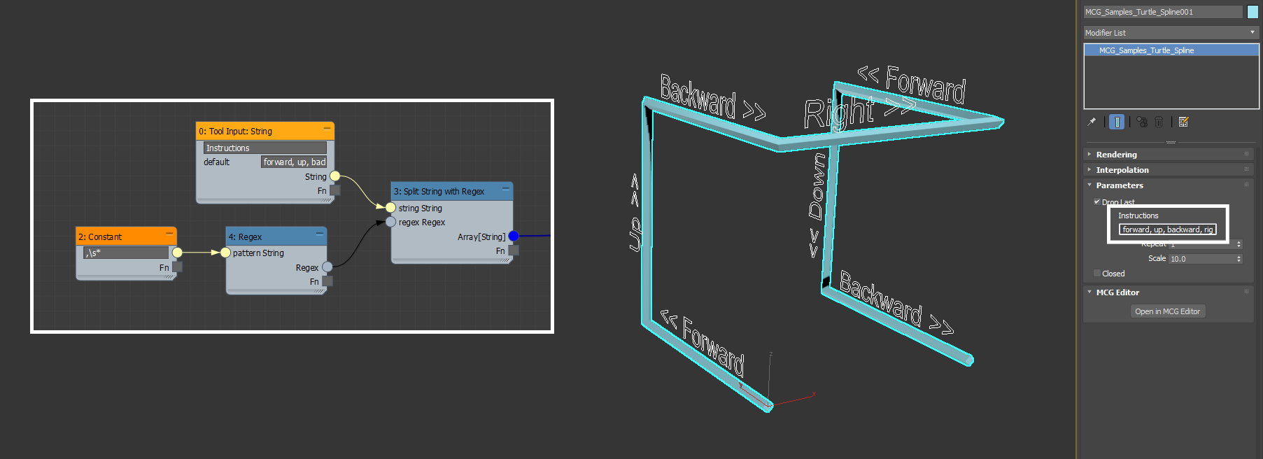 In the graph above, a sequence of instructions is split and converted into a series of transforms to create a spline.