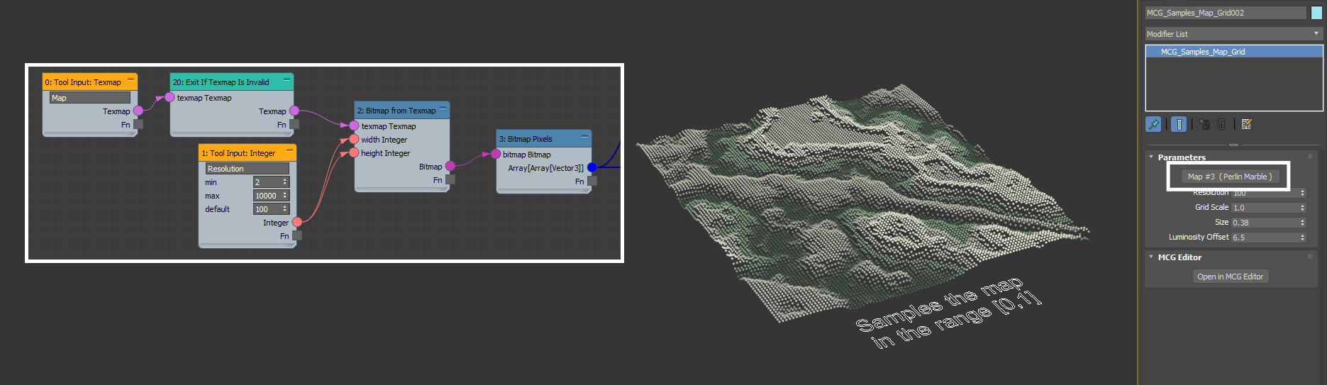 The Tool Input: Texmap creates a texture map button which can be used to acquire a map into the graph. This map is typically rendered to a bitmap to extract its color values. The bitmap rendering process samples the given texmap in the UV Space [0,1], so for maps such as Noise, the map's scale must be set to a relatively low value (0.06).