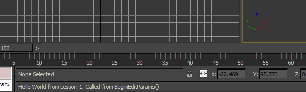 The learning path source zip file contains a folder named "Lesson1a". This is a compressed Visual Studio project created using the plug-in wizard. To demonstrate an interaction with the 3ds Max that we can observe on the screen, we print a message in the prompt bar of the 3ds Max window when the user selects our plug-in. For this purpose we have modified the function <yourpluginname>::BeginEditParams()