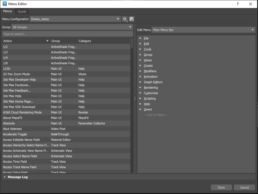 3ds Max has a Menu Editor that allows you to customize existing menus and create new ones. It is similar in design to the Hotkey Editor.