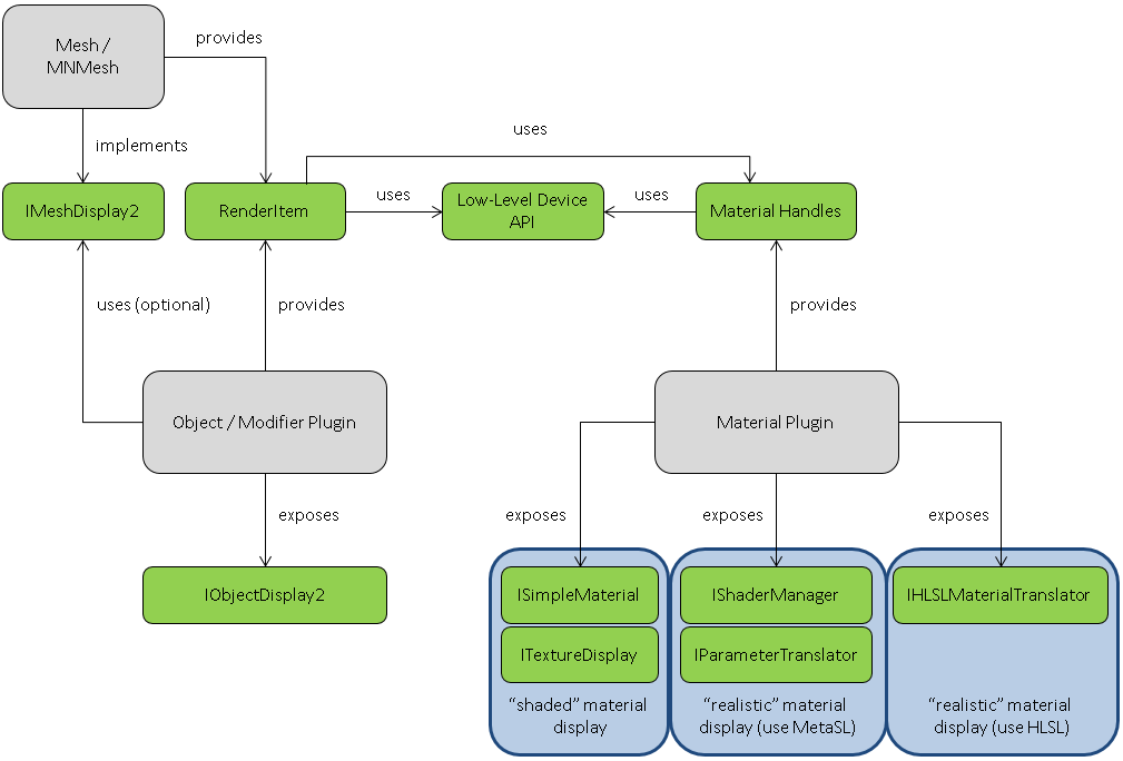 The Plugin Display SDK (previously called the Nitrous SDK) can be used by object/modifier plugins and material plugins to customize the way they display in the Nitrous viewport. The following diagram is a high-level overview of the classes and interfaces in this SDK.