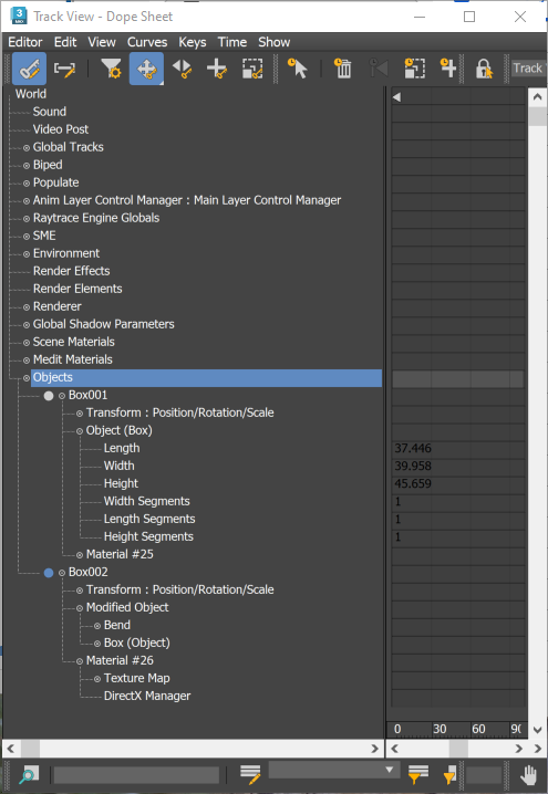 If a node does not have some of these assigned (for example the material and visibility controller) these sub-animatables are NULL. Any sub-animatables that are NULL don't appear in Track View.