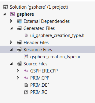 Save the form as gsphere_creation_type.ui in the project folder, and then add it to the Resource Files in the Solution Explorer in Visual Studio. Because this is a Qt Add-in project, Visual Studio recognizes the UI file and creates an associated header for it: